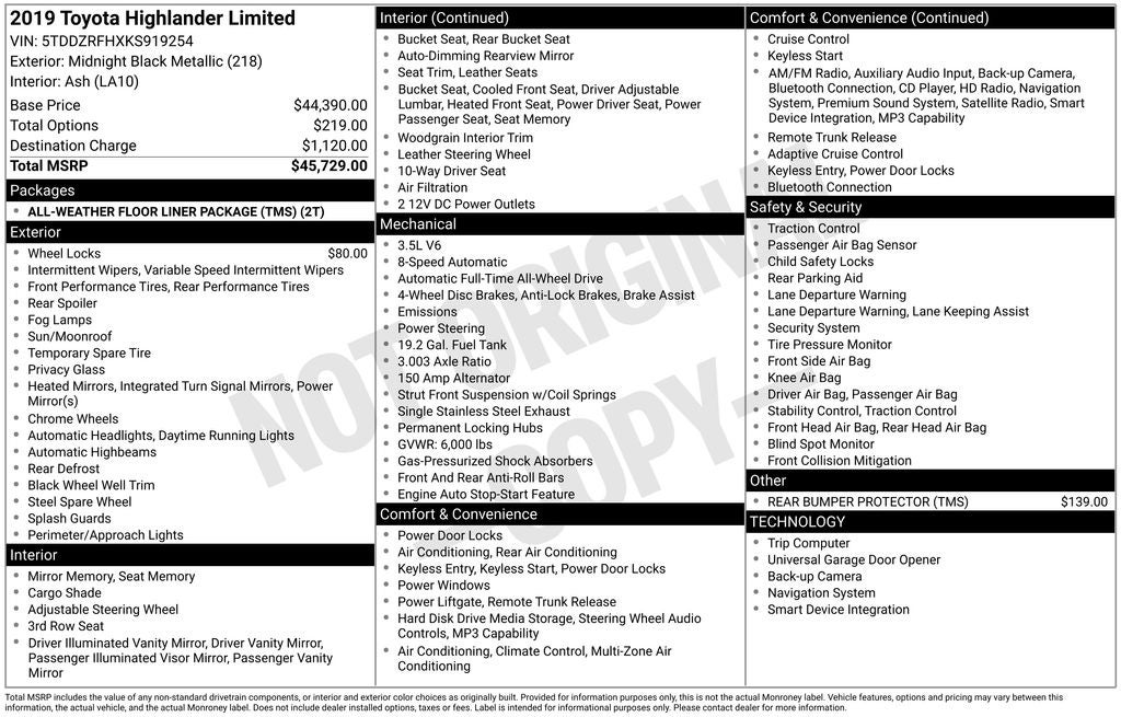 Midnight Black Metallic 2019 Toyota Highlander Limited AWD 8-Speed Automatic Electronic with ECT-i 3.5L V6 AWD.