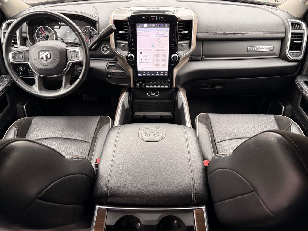 Diamond Black Crystal Pearlcoat Laramie 4WD 6-Speed Automatic Cummins 6.7L I6 Turbodiesel Sunroof / Moonroof, Back Up Camera, Bluetooth®, 10 Speakers, 115V Auxiliary Rear Power Outlet, 12 Touchscreen Display, 220 Amp Alternator, 2nd Row In Floor Storage Bins, 3.73 Axle Ratio, 4-Wheel Disc Brakes, 4G LTE Wi-Fi Hot Spot, 5th Wheel/Gooseneck Towing Prep Group, ABS brakes, Active Noise Control System, Alexa Built-In, AM/FM radio: SiriusXM with 360L, Apple CarPlay/Android Auto, Auto Adjust In Reverse Exterior Mirrors, Auto Dimming Exterior Passenger Mirror, Auto High Beam Headlamp Control, Auto Power-Folding Mirrors, Auto-Dimming Exterior Mirrors, Automatic temperature control, Bed Utility Group, Blind Spot & Cross Path Detection, Brake assist, Bright Front Bumper, Bright Rear Bumper, Center Hub, Chrome Bumper Package, Chrome Exterior Mirrors, Clearance Lamps, Connected Travel & Traffic Services, Connectivity - US/Canada, Disassociated Touchscreen Display, Dual front impact airbags, Dual front side impact airbags, Dual Rear Wheels, Electronic Stability Control, Exterior Mirrors Courtesy Lamps, Exterior Mirrors w/Heating Element, Exterior Mirrors w/Memory, Exterior Mirrors w/Supplemental Signals, Foam Bottle Insert (Door Trim Panel), For Details Visit DriveUconnect.com, Forward & Reverse Utility Lights, Front anti-roll bar, Front Center Armrest w/Storage, Front dual zone A/C, Front LED Fog Lamps, Front Seat Back Map Pockets, Fully automatic headlights, GPS Navigation, Heated door mirrors, Heated Front Seats, Heated Steering Wheel, Integrated Voice Command w/Bluetooth®, Laramie Level 1 Equipment Group, Leather Trim 40/20/40 Bench Seat, LED Bed Lighting, LED Reflector Headlamps, LED Tail Lamps, Low tire pressure warning, Mirror Running Lights, MOPAR Deployable Bed Step, MOPAR Spray In Bedliner, Navigation System, Occupant sensing airbag, Off-Road Information Pages, Overhead airbag, ParkSense Front/Rear Park Assist System, ParkView Rear Back-Up Camera, Power Adjust 8-Way Driver Seat, Power Adjust Mirrors, Power Adjustable Pedals w/Memory, Power driver seat, Power Heat Fold Memory Telescopic Mirrors, Power passenger seat, Power Sunroof, Power Telescoping Mirrors, Power-Adjustable Convex Aux Mirrors, Quick Order Package 2HH Laramie, Radio: Uconnect 5 Nav w/12.0 Display, Rain Sensitive Windshield Wipers, Rear 60/40 Folding Seat, Rear Power Sliding Window, Rear Window Defroster, Remote keyless entry, Remote Tailgate Release, Security system, Selectable Tire Fill Alert, Speed control, Tilt steering wheel, Traction control, Trailer Tow Pages, Variably intermittent wipers, Wheels: 17 x 6.0 Polished Aluminum.