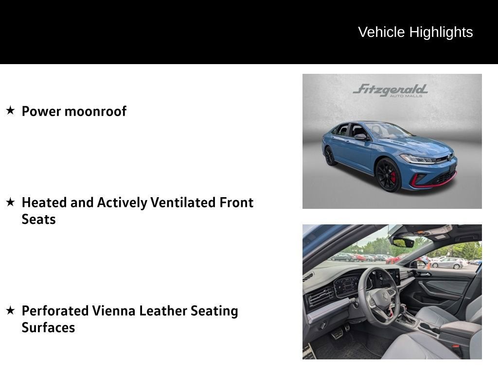 2026 Monterey Blue Pearl Volkswagen Jetta GLI 7-Speed DSG Automatic with Tiptronic Heated and Actively Ventilated Front Seats, Perforated Vienna Leather Seating Surfaces, Power moonroof. 2.0L TSI DOHC 2.0T Autobahn Volkswagen Certified Pre-Owned Details:* 100+ Point Inspection* Roadside Assistance* Volkswagen Certified Pre-Owned Limited Warranty Coverage: 2-Years/24,000-Miles (whichever occurs first) High-Voltage Battery Limited Warranty: 8 Years/100,000 Mile (whichever occurs first) 2 Years of 24-Hour Roadside Assistance, Three Months of SiriusXM Platinum Plan Trial Subscription* Vehicle History* Warranty Deductible: $50You will love our NO HAGGLE, NO HASSLE PRICING here at Fitzgerald Auto Mall. Ask us about our BUYER PROTECTION PLAN, LOANER CAR PROGRAMS, AND FREE Vehicle History Report. Can not find what you want?? NO PROBLEM! We have over 1,000 Pre-Owned vehicles available at WWW.FITZMALL.COM. You can also visit us in person at 114 Baughmans Lane Frederick MD, 21702 or Call Us @240-629-7301.
